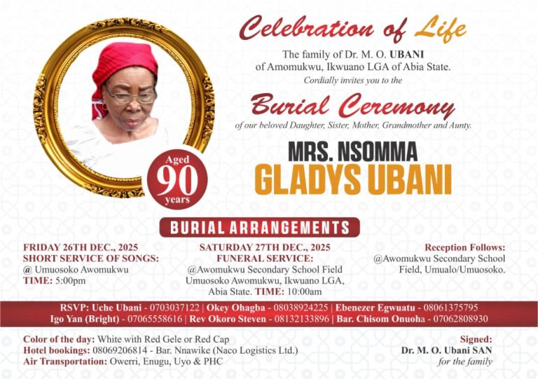 He extended an open invitation to friends, colleagues, and well-wishers to join the Ubani family in celebrating the life and legacy of their beloved matriarch, noting that the event will be a thanksgiving for a life well spent.