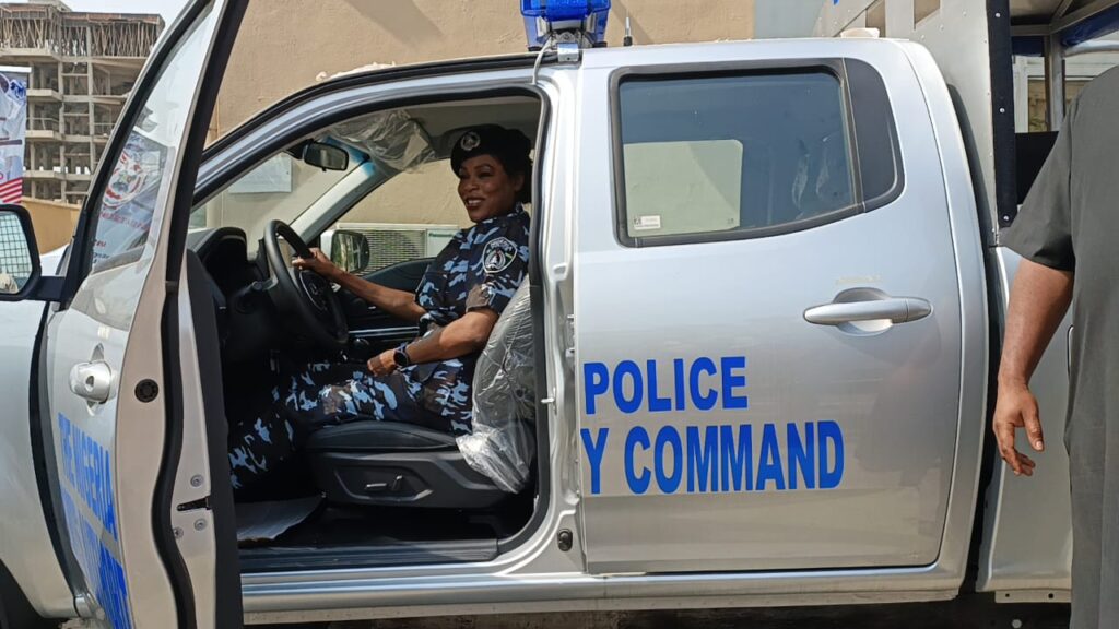 CP Toyin Agbaminoja, Commissioner of Police in charge of the Port Authority Police (Western) Command, Lagos in the operational vehicle