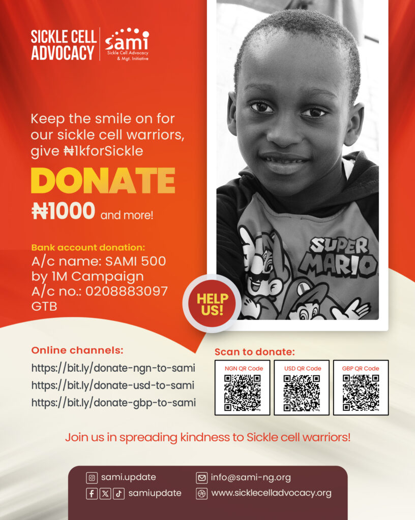 He indicated that Nigerians who wish to donate to the ongoing #1kforSickle campaign can donate via: A/c name: SAMI 500 by 1M Campaign, GTB – 0208883097 or use the online channels found on the official promotional materials.