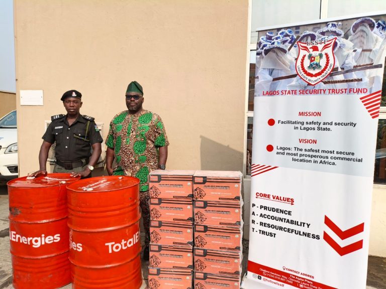 The Lagos State Security Trust Fund (LSSTF) today donated two drums of oil and ten batteries to the Lagos State Marine Police to support marine patrol and security operations on the state’s waterways. Each drum contains 205 litres of oil, while the batteries are 12V 100Ah (20HR).