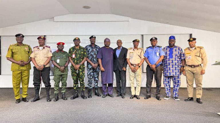 L-R: Deputy Commandant of Narcotics, NDLEA Lagos Command, DCN Akogun James; Sector Commander, FRSC Lagos State, CC Kehinde Hamzat; Commander, 9 Brigade, Nigerian Army, Brig Gen. Ayokunle Owolabi; AIG Zone 2, AIG Olorundare Jimoh; Executive Secretary/CEO, Lagos State Security Trust Fund, Dr. Ayo Ogunsan; Board Member, LSSTF, DIG Agboola Oshodi-Glover; Comptroller, Nigerian Immigration Service, Lagos Command, CIS Christopher Onajinrin; Deputy Commissioner of Police, DC Admin, Western Ports Command, DCP Agboola Abiodun; Director, Admin, LSSTF, Mr. Adegbola Lewis and Comptroller, NIS, MMIA Command, CIS Christopher Uzoma during the Opening Ceremony of the 2026 LSSTF Statewide Inter-Agency Training for Security Operatives in Lagos organized by LSSTF