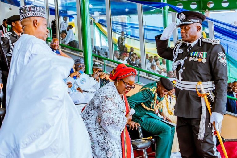 IGP Olatunji Rilwan Disu gives a salute to the Vice President Senator Kashim Shettima during the National Police Day 2026